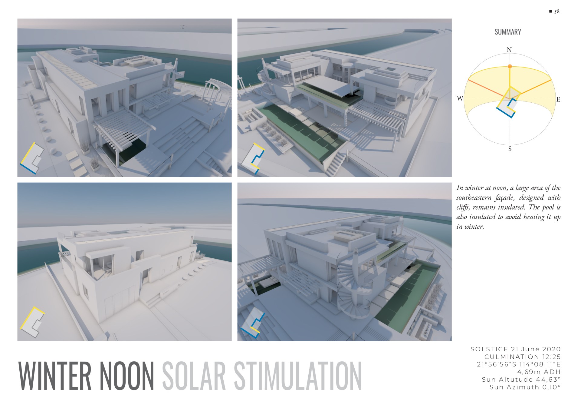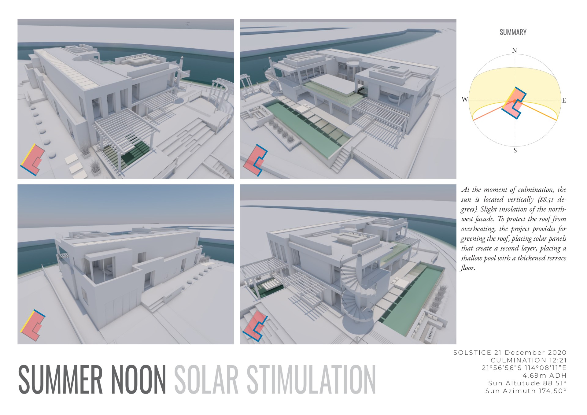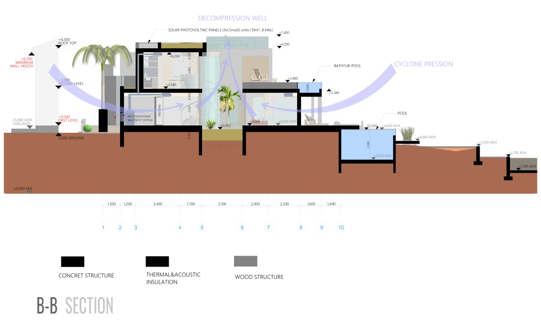 The project is based on scientific research on the simulation of insolation of the site with recommendations for architectural design. The presence of cyclones is also reflected in the architectural solution – the concrete monolithic structure of the house has an internal glazed atrium for decompression of air pressure during a cyclone. All wooden structures of the Сonditional Development Area are made on separate foundations that are not connected with the main concrete structure. The house can either work in isolated mode (with air