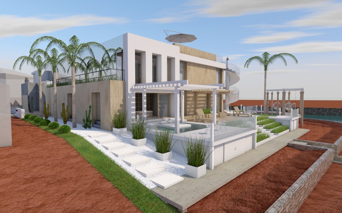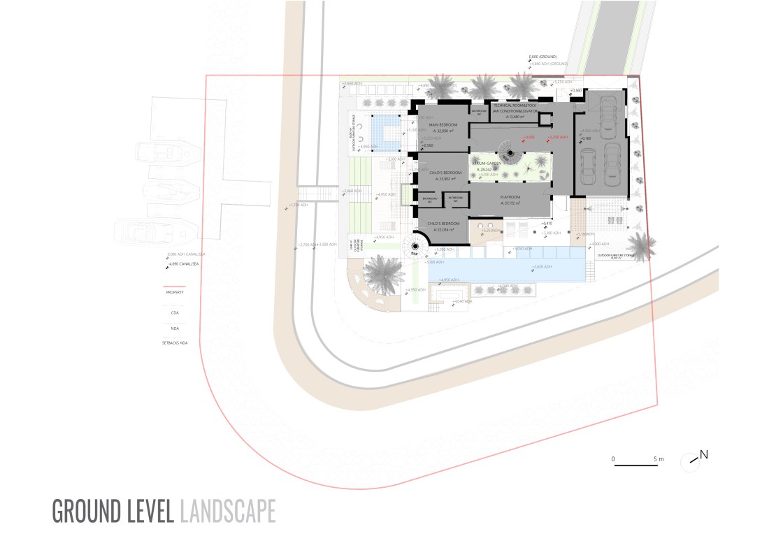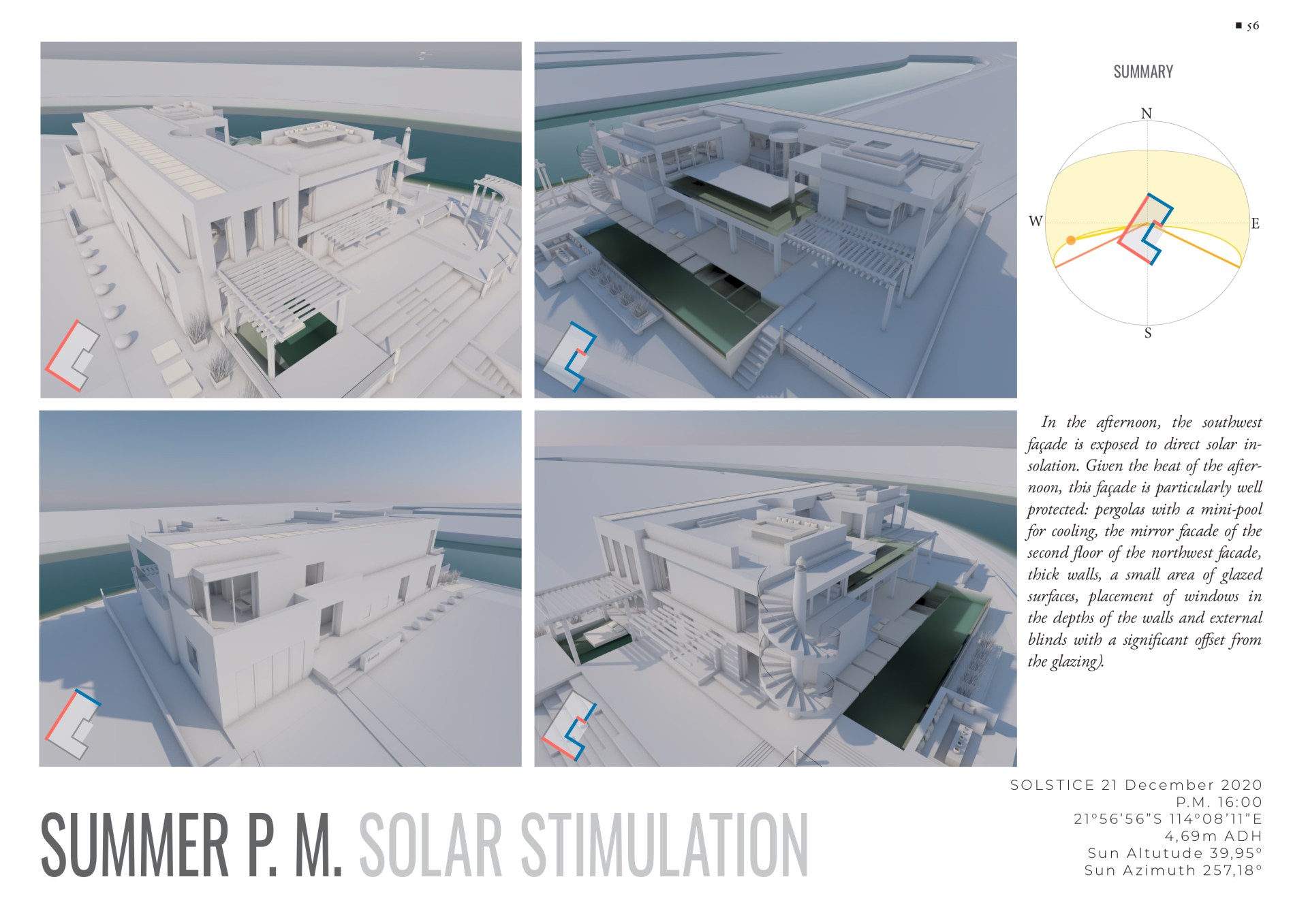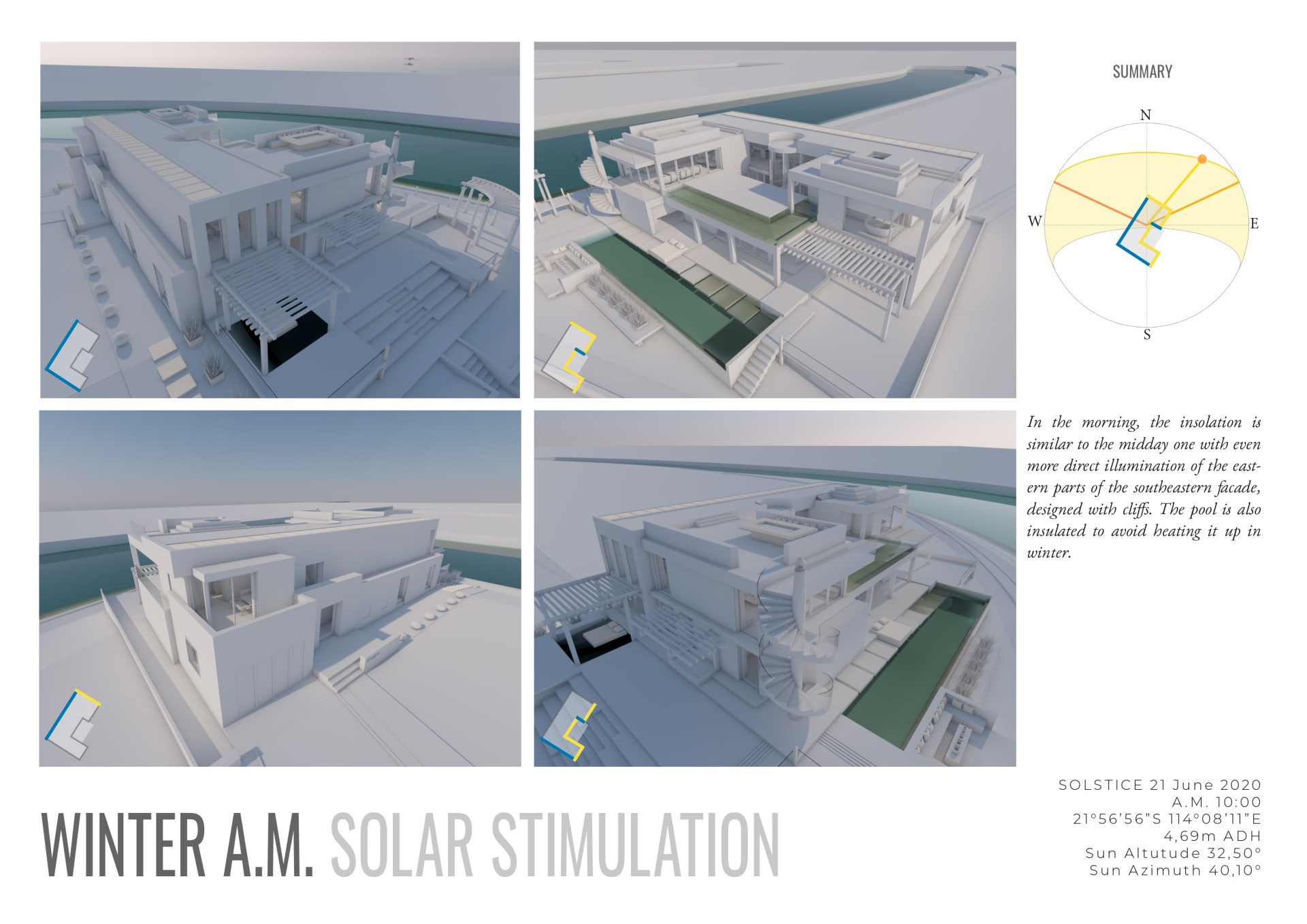 The project is based on scientific research on the simulation of insolation of the site with recommendations for architectural design. The presence of cyclones is also reflected in the architectural solution – the concrete monolithic structure of the house has an internal glazed atrium for decompression of air pressure during a cyclone. All wooden structures of the Сonditional Development Area are made on separate foundations that are not connected with the main concrete structure. The house can either work in isolated mode (with air