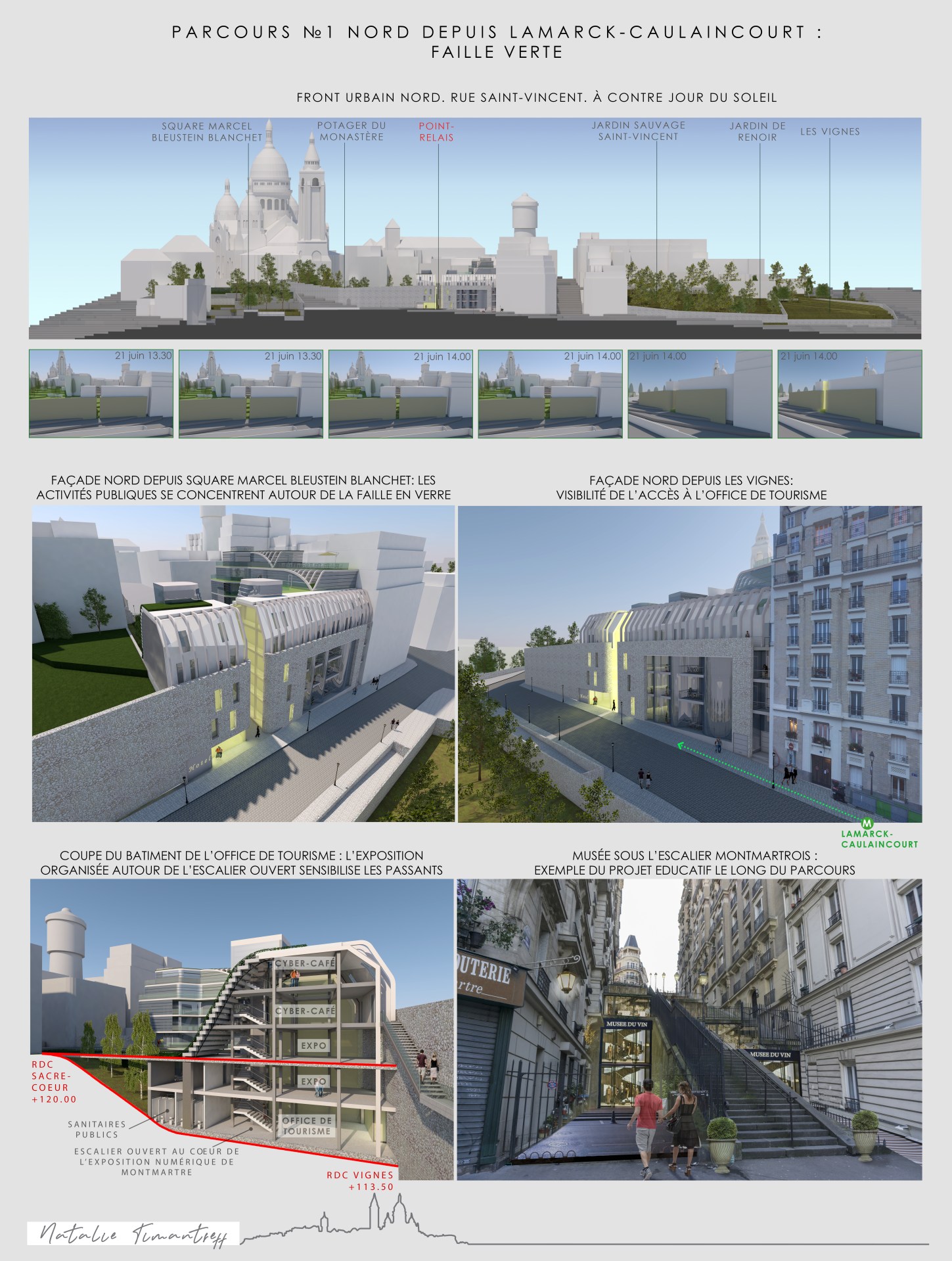 Le projet architectural propose de découvrir le quartier par le nord de Montmartre où se concentre un patrimoine paysager très important. L’équipement du point-relais facilite l’accès au Sacré-Cœur et en même temps informe, sensibilise et organise l’accueil touristique. La faille dans le front urbain permet d’identifier l’équipement touristique, en organisant l’insertion dans le contexte : la façade nord s’inscrit dans l’environnement architectural et la façade sud se disperse dans le paysage.