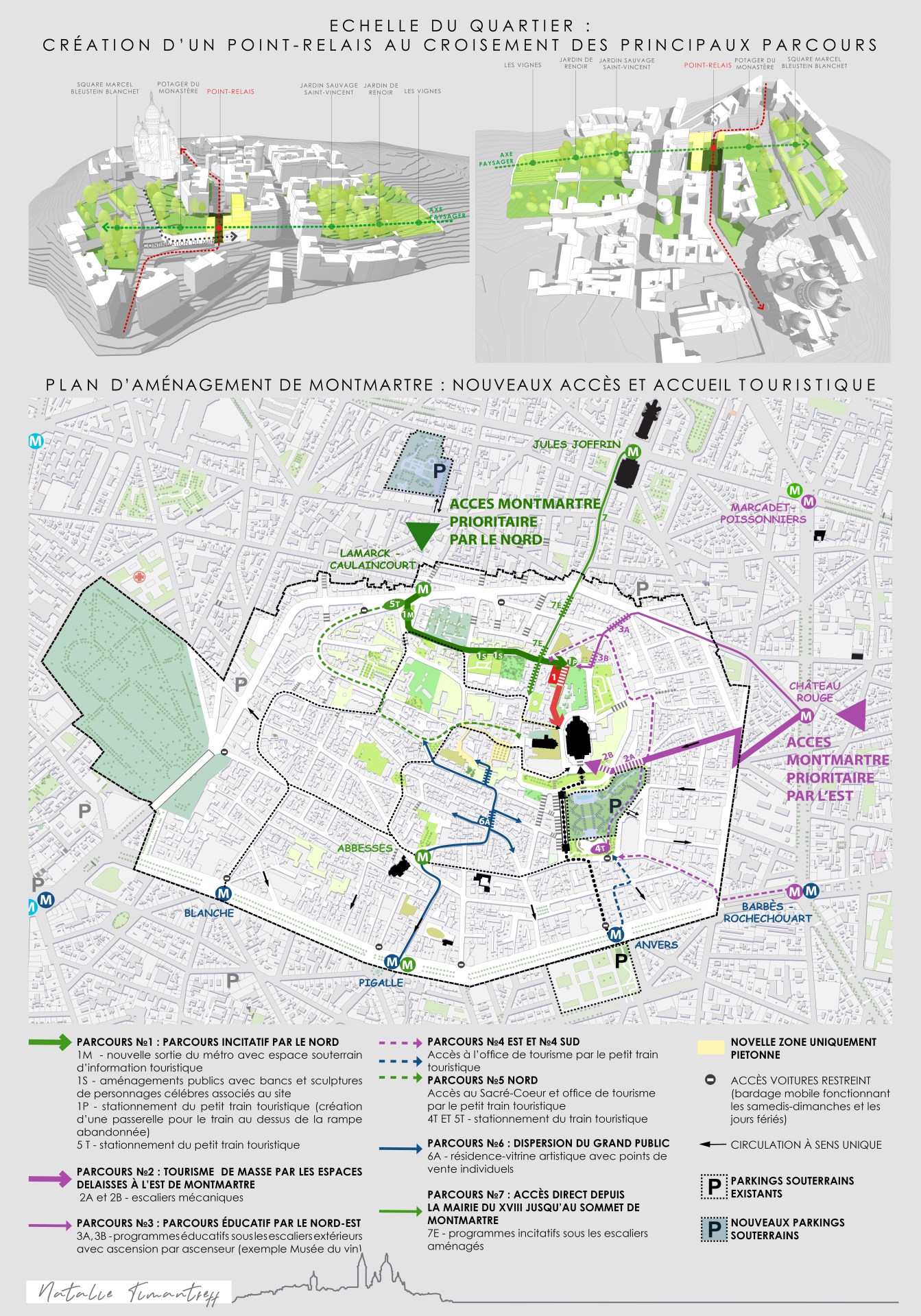 1) Faire découvrir un autre côté de Montmartre, plus profond que la simple visite du Sacré-Cœur, par le Nord du quartier, depuis les pôles de transports collectifs en utilisant des aménagements urbains incitatifs et éducatifs.