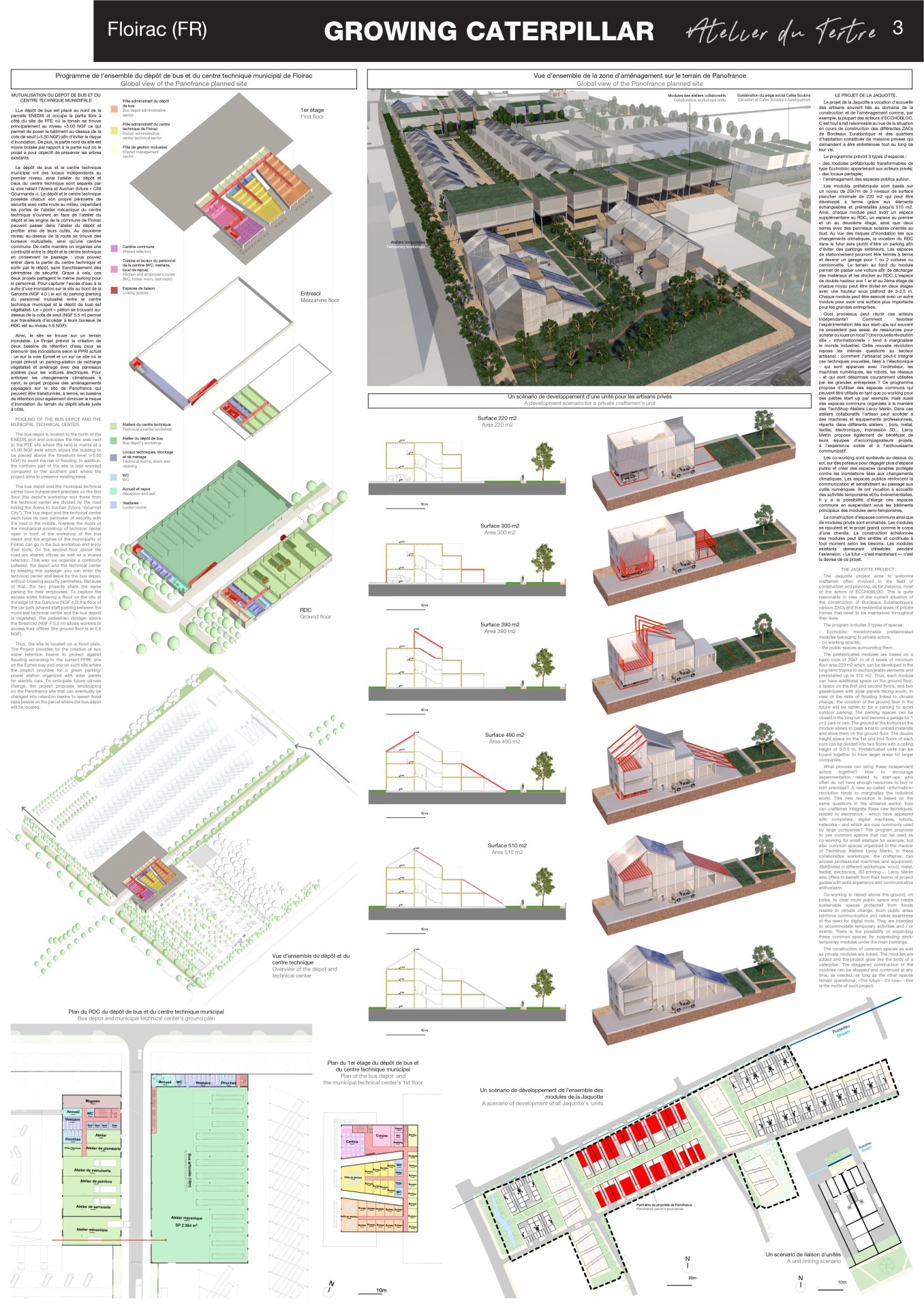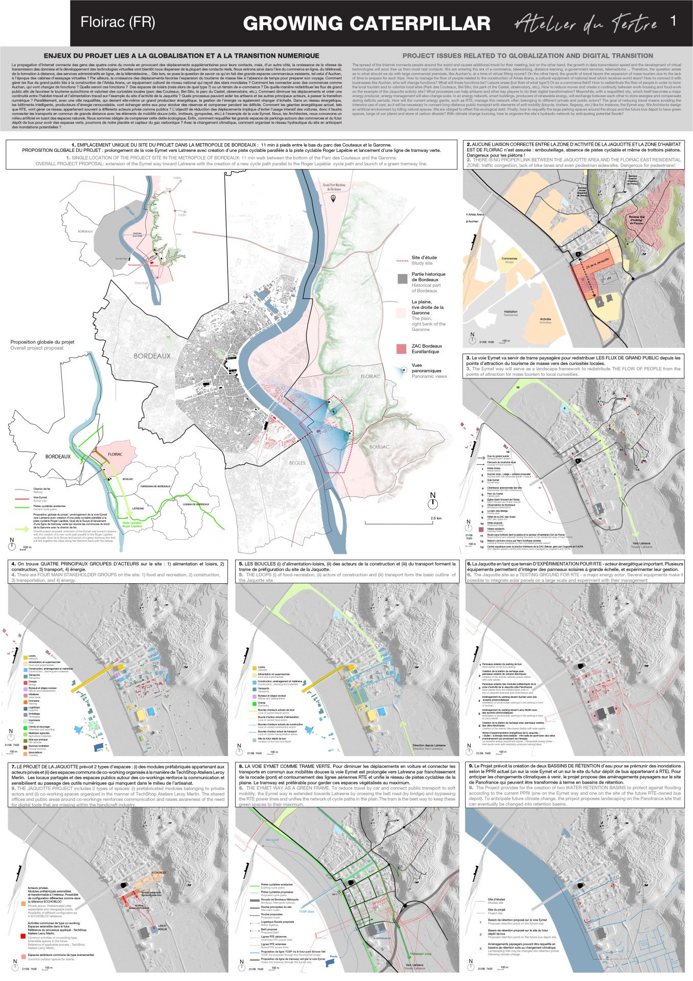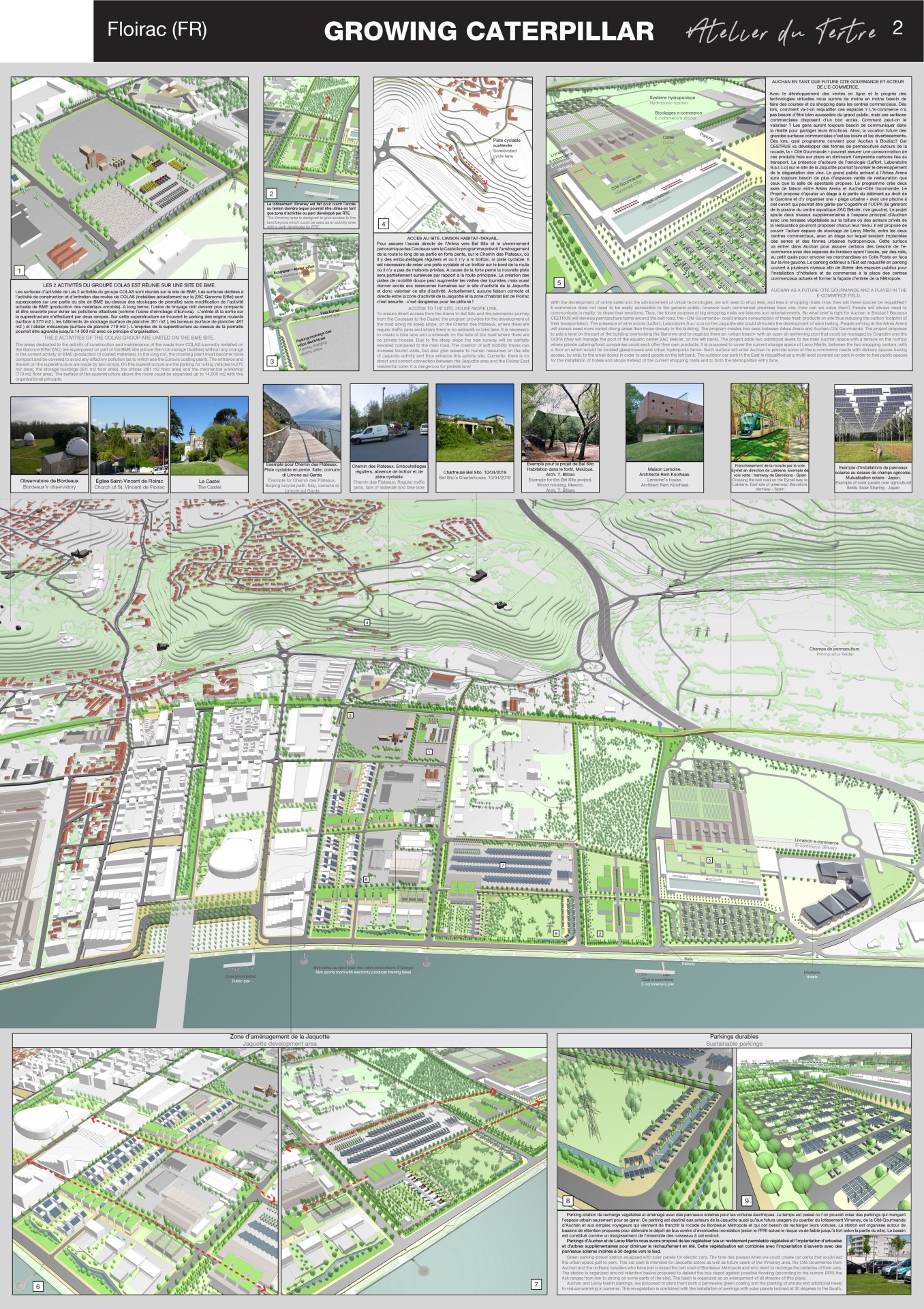The spread of the Internet connects people around the world and causes additional travel for their meeting, but on the other hand, the growth in data transmission speed and the development of virtual technologies will soon free us from most real contacts. We are entering the era of e-commerce, teleworking, distance learning, e-government services, telemedicine … Therefore, the question arises as to what should we do with large commercial premises, like Auchan’s, at a time of virtual fitting rooms? On the other hand, the growth of travel favors the expansion of mass tourism due to the lack of time to prepare for such trips. How to manage the flow of people related to the construction of Arkéa Arena, a cultural equipment of national level which receives world stars? How to connect it with businesses like Auchan, who will change functions? What will these functions be? Leisure areas (but then of what type?) Or an e-commerce field? How to redistribute the flow of people in order to favor the local tourism and to valorize local sites (Park des Couteaux, Bel Sito, the park of the Castel, observatory, etc.). How to reduce moves and create a continuity between work-housing and food-work on the example of the Jaquotte activity site? What processes can help artisans and other key players to do their digital transformation? Meanwhile, with a requalified city, which itself becomes a major energy producer, energy management will also change scale. In an energy network, smart buildings, producers of renewable energy, will exchange between each other to store energies and compensate during deficits periods. How will the current energy giants, such as RTE, manage this network often belonging to different private and public actors? The goal of reducing travel means avoiding the intensive use of cars, so it will be necessary to connect long-distance public transport with elements of soft mobility (bicycle, trotters, Segway, etc.) like for instance, the Eymet way. We Architects design an artificial environment by killing natural spaces. We are obliged to offset this ecological debt. Finally, how to requalify the large parking spaces around the shops and the future bus depot to have green spaces, lungs of our planet and store of carbon dioxide? With climate change looming, how to organize the site’s hydraulic network by anticipating potential floods?